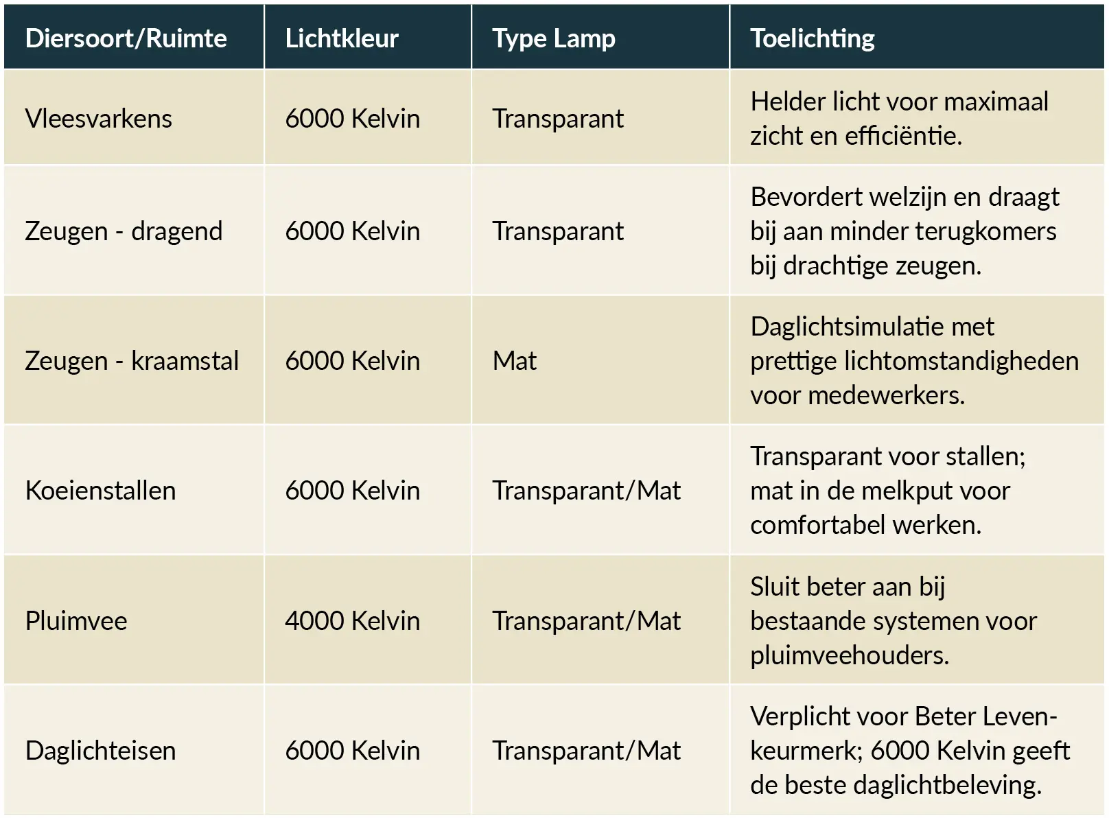 De juiste lichtkleur en intensiteit dragen bij aan zowel dierenwelzijn als productiviteit. Valk-Agro biedt een breed scala aan verlichtingsoplossingen, afgestemd op specifieke diersoorten en situaties: